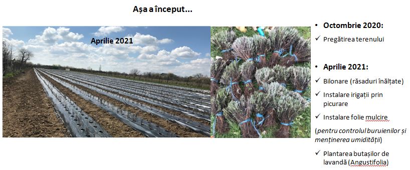 Pentru a putea oferi calitatea inconfundabilă a produselor obținute natural, agricultura practicată în grădina de vacanță Lizaroma este bazată pe cultivarea și întreținerea manuală a plantelor, asupra cărora nu se intervine cu substanțe chimice, pentru menținerea unei veritabile oaze de relaxare, în directă conexiune cu natura, benefică pentru o stare generală de armonie. Pentru dezvoltarea grădinii Lizaroma au fost aplicate tehnici moderne de cultivare a plantelor pe răsaduri înălțate (biloane), cu sistem de picurare aplicat sub folia de mulcire, elemente care au făcut diferența pentru obținerea unor plante sănătoase, cu evitarea excesului de apă, nedorit atât din perspectiva protecției resurselor naturale, cât și pentru a evita afectarea rădăcinilor lavandei, cu menținerea unui nivel de umiditate necesar dezvoltării armonioase a plantelor, chiar și în perioadele secetoase. Este știut că, fiind o plantă de origine mediteraneeană, lavanda nu are nevoie de mari cantități de apă. Totuși, pentru dezvoltarea optimă a plantelor tinere sau în perioadele de secetă prelungită, apa este necesară, cu atât mai mult, cu cât în Câmpia Română seceta poate fi accentuată. Nu în ultimul rând, pentru evitarea dezvoltării copleșitoare a buruienilor, care ar putea face foarte dificilă întreținerea exclusiv manuală a plantelor, aplicarea foliei de mulcire și a unei scheme de plantare inteligente au sprijinit încurajarea contopirii armonioase a tufelor de lavandă și reducerea la maxim a șanselor de propagare a buruienilor între plante. O grijă aparte este acordată tunderii și curățării tufelor de lavandă la finalul lunii octombrie, pentru întinerirea ramurilor și menținerea formei frumoase a acestora în sezonul următor.