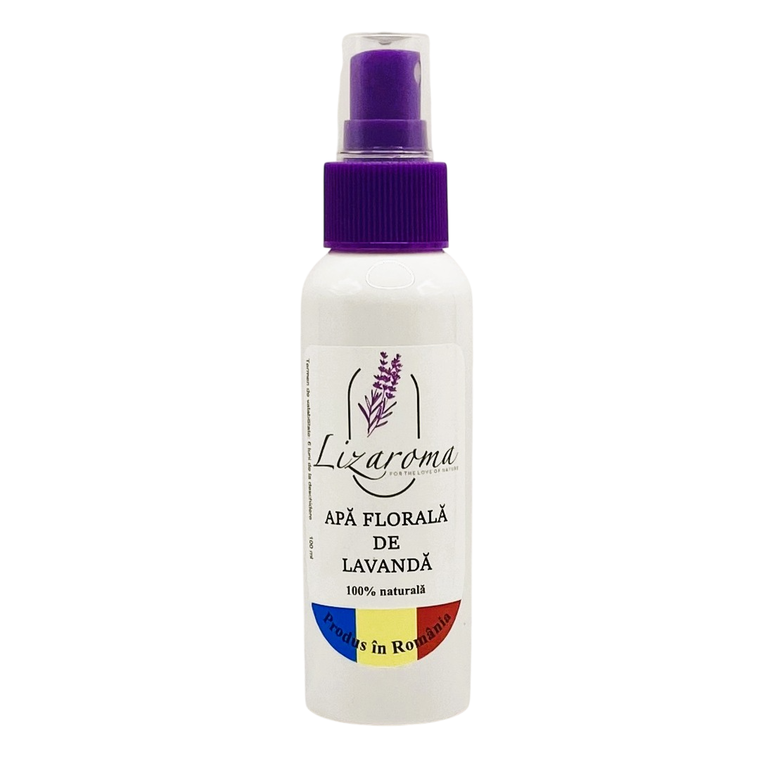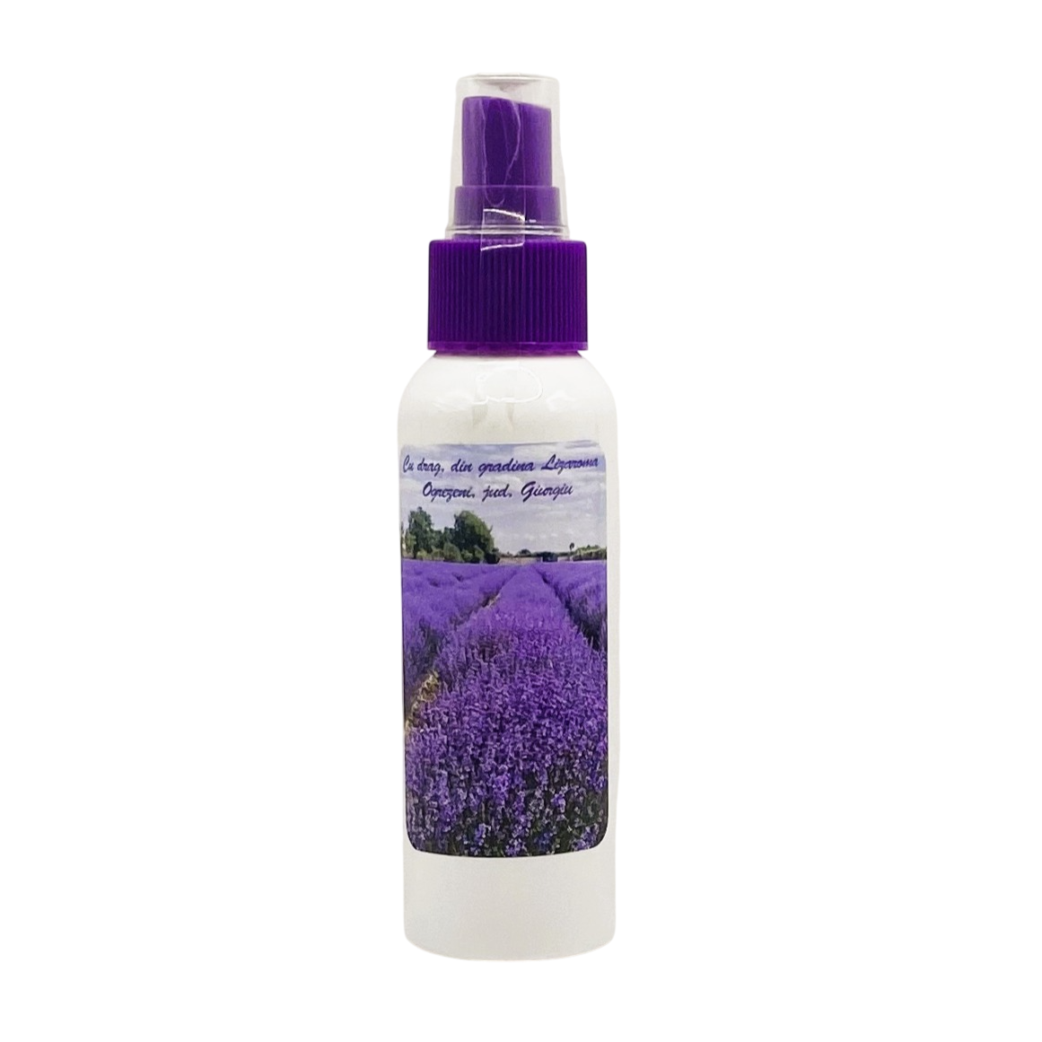 Un flacon cu apă florală de lavandă (hidrolat), prezentată în flacon din plastic alb mat (reciclabil 100%) cu pulverizator tip spray, de culoare mov, având capacitate de 100 ml, dedicat utilizării frecvente, atât acasă, cât și la serviciu. Produs cu multiple utilizări: împrospătează într-o clipă aerul înconjurător şi rufele şi conferă luminozitate tenului, fiind foarte potrivită pentru hidratarea pielii şi întreţinerea stării bune a acesteia
