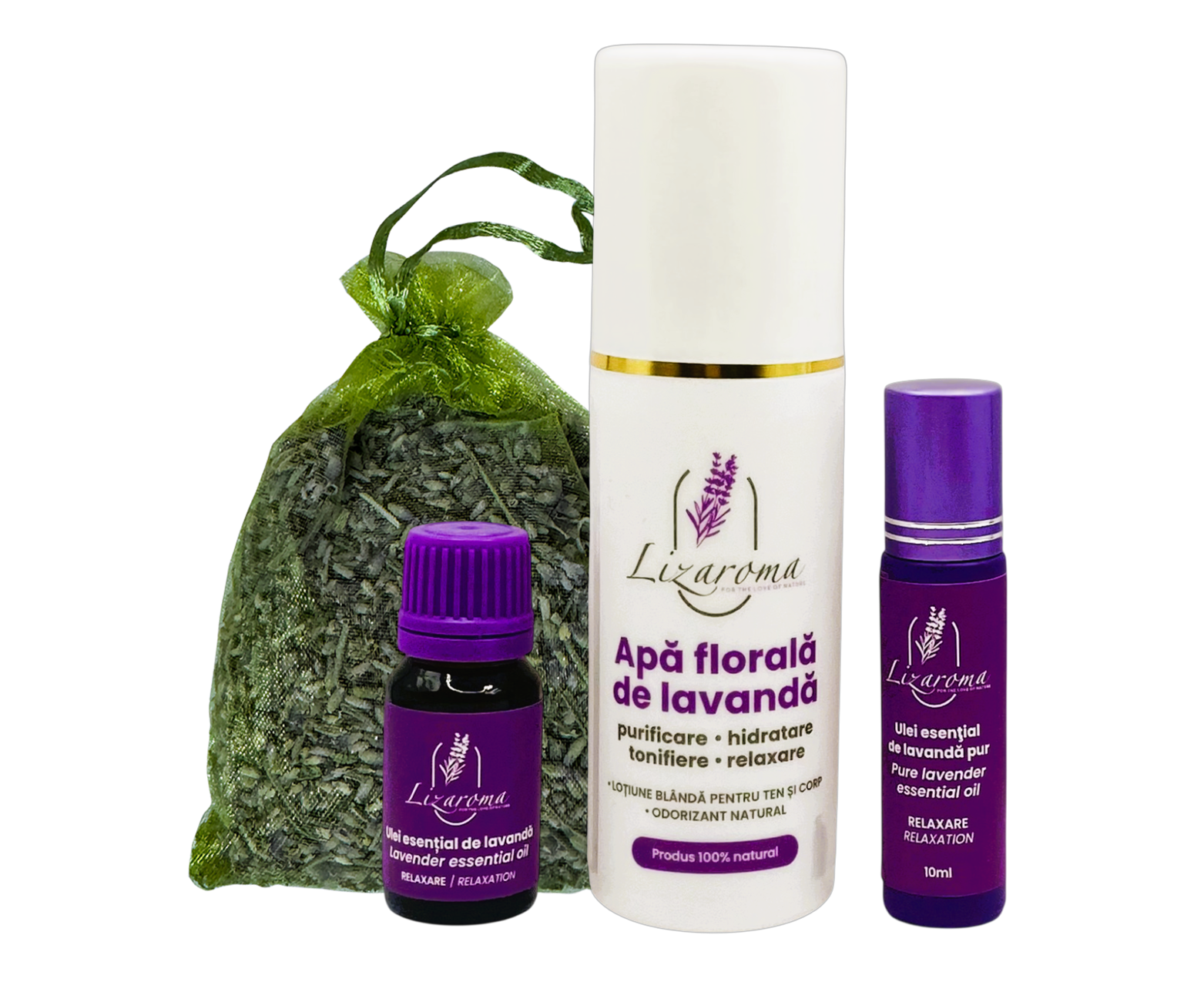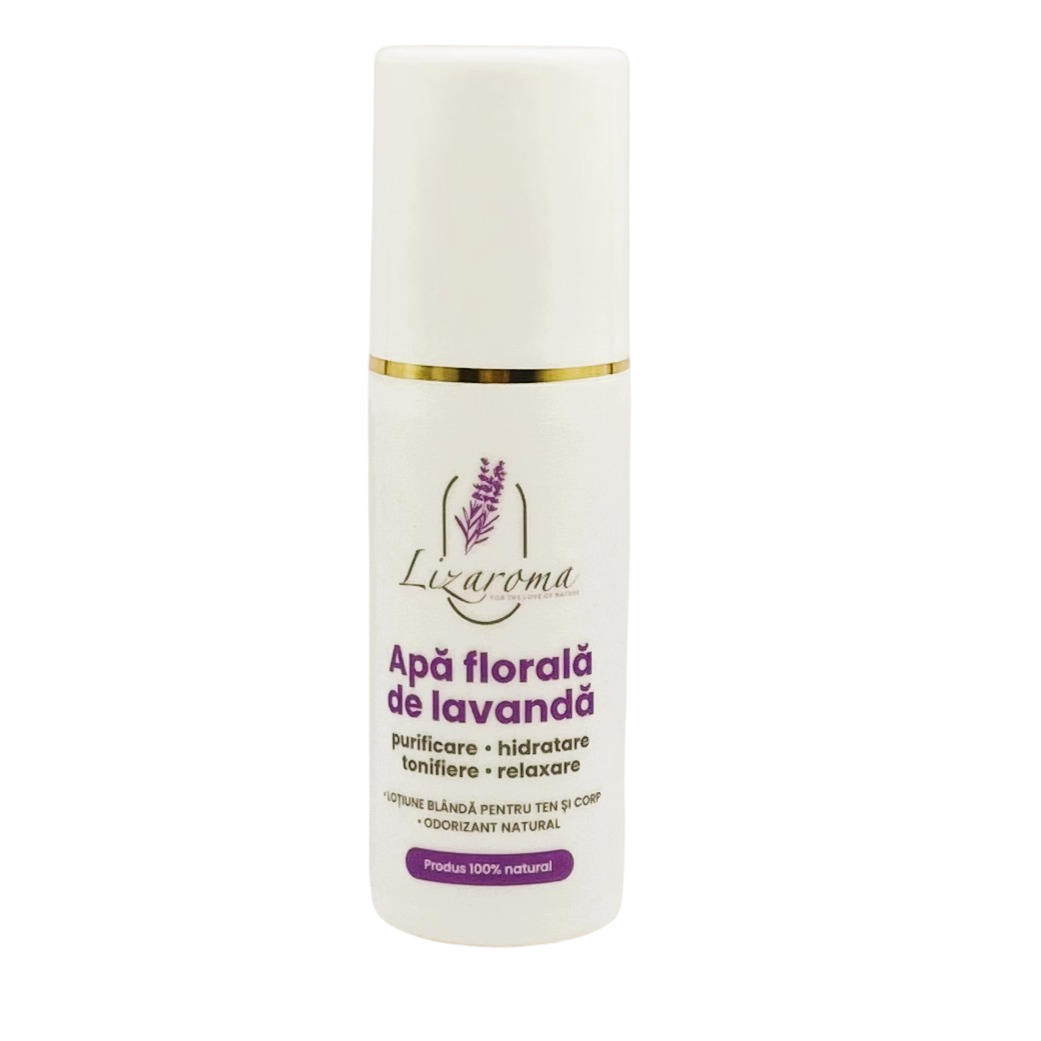 Ingrediente: Apă distilată microbiologic pură, molecule de ulei esențial 100% pur și natural de lavandă (maxim 2-3%),
