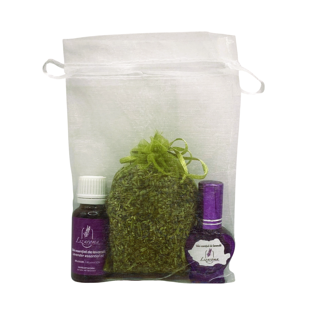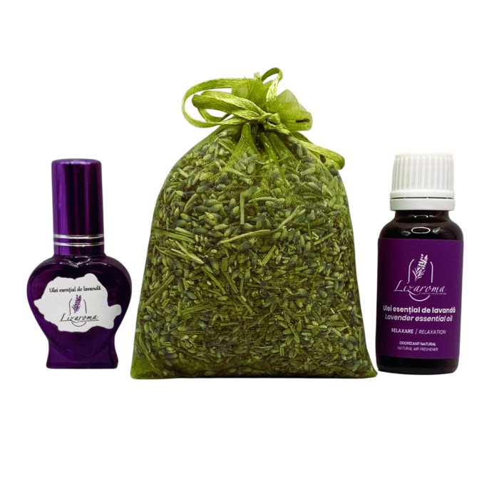 Potrivit pentru mici cadouri cu semnificaţie, acest set oferă două sticluţe, una cu spray (10ml), cealaltă cu picurător (20ml), acompaniate de un săculeţ cu floare de lavandă uscată. Acest set-odorizant cu ulei esenţial pur de lavandă poat surprinde plăcut iubitorii de arome naturale intense.