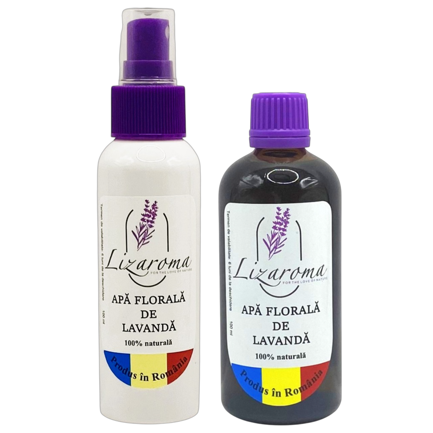 Beneficii:Apa de florală de lavandă (sau hidrolatul de lavandă) cu parfumul ei delicat, potrivit atât doamnelor, cât și domnilor, este ideală pentru tonifierea pielii și în cazul arsurilor de soare sau înțepăturilor de insecte. Are acțiune calmantă și reconfortantă. Este un bun repelent împotriva insectelor. Prin pulverizare, parfumează rufele din dulap și aerul ambiant. Miros: Caracteristic de lavandă, aromat, floral, ușor dulce, proaspăt.Are o notă florală unică, care răspândește o mireasmă proaspătă. Valoare pH: 4,5 Precauții: